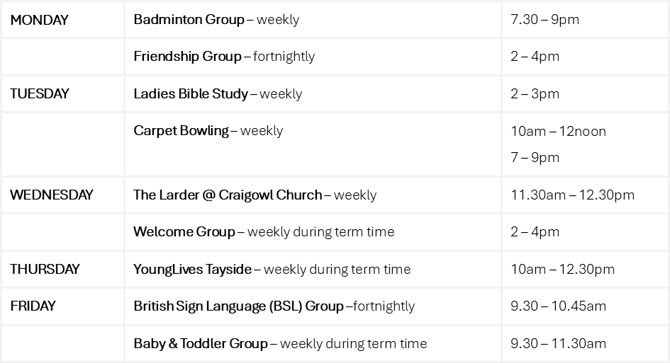 The Larder @ Craigowl Church – in response to the increasing level of hardship being experienced by folks in our community some food essentials are made available. The larder is open every Wednesday from 11.30am – 12.30pm. No referral is required. Larder membership is £2 per visit and this membership allows each person to receive 10 items from the available stock.